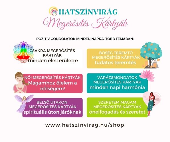 A Hatszínvirág Shopban már elérhetőek Megerősítés Kártyáink is több témában, amikben összegyűjtöttem egy-egy csokorba azokat a mondatokat, amikkel én magam is dolgoztam az elmúlt évek során egy-egy témában.